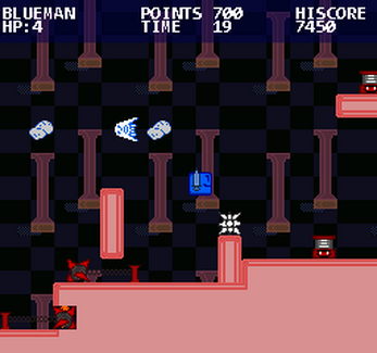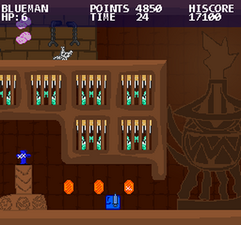 Blueman is a platformer game with bite sized levels, a strict time limit, and collectables to increase your score. Points are important beyond just getting a high score- earning points grants you more health! The order of the stages is randomized, and you only have to finish 5 levels to get to the next world. For experienced explorers, an optional "Gauntlet mode" has you play every single last level.